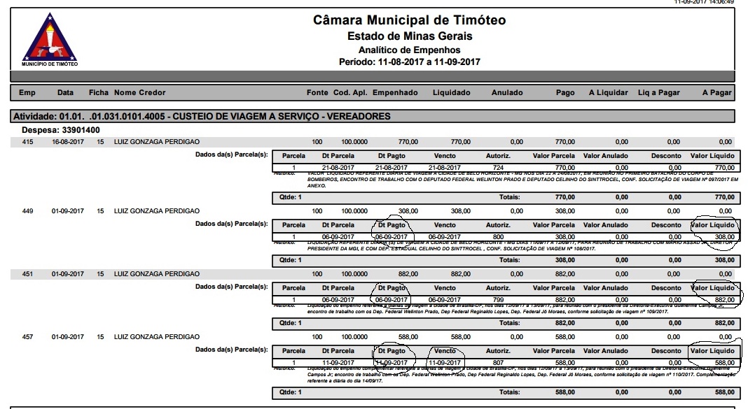 Conforme histórico de empenhos obtido com exclusividade pelo Jornal Bairros Net o deslocamento dos ‘edis’ Timotenses foi articulado no dia 01/09 de forma um tanto quanto atrapalhada: iniciou-se com o empenho referente ao pedido de viagem 108/2017 que previa apenas o trajeto para a capital das Alterosas com retorno na terça-feira. Entretanto, pouco depois os vereadores decidiram por estender através do pedido de viagem nº 109/2017 a ida a capital Federal com retorno do dia 13/09. No mesmo dia o pedido de viagem 110/2017 oficializou a alteração da data de retorno para o dia 14/09 e solicitou a complementação dos valores no total de R$ 588,00.