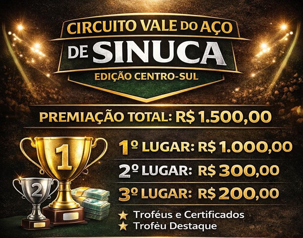 TIMÓTEO – A cidade de Timóteo será palco de um evento esportivo inédito que promete movimentar o cenário da sinuca regional: o Circuito Vale do Aço de Sinuca – Edição Centro Sul. A competição será realizada no próximo (25), a partir das 10 horas, no tradicional Bar Galpão, localizado na Praça 29 de Abril, no bairro Centro Sul.